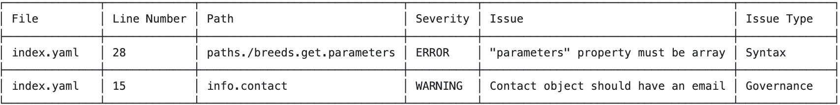 Validation results now include an "Issue Type" column that distinguishes between Syntax errors (structural/parsing issues) and Governance violations (rule-based issues). This helps you quickly identify and prioritize what to fix first.